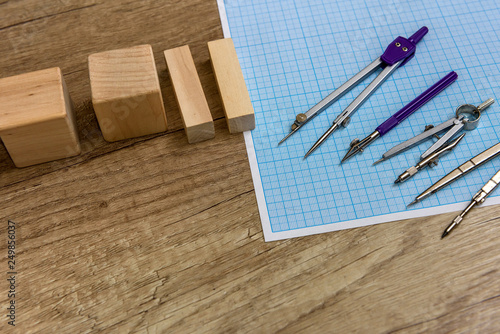 Millimeter paper with draw tools and wooden blocks