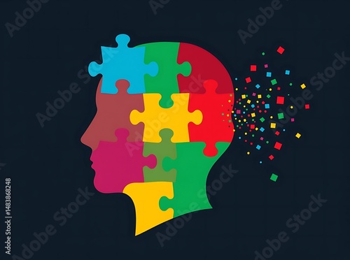 Mind Puzzle: The human mind is represented by a silhouette of a head, creatively transformed into a colorful jigsaw puzzle, representing the intricate beauty of cognition and thoughts.