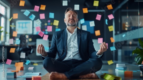 Mindful Amidst Chaos: A businessman finds inner peace amidst the storm of colorful sticky notes in a modern office.
