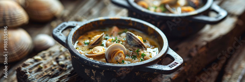Miniature cast iron pots with New England clam chowder. Rustic lakeside cabin setting. with space for text