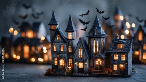 building, miniature, house, architecture, roof, window, light, night, evening, dark, shadow, decorative, ornament, fantasy, detail, exterior, structure, facades, design, skittish, halloween, holiday, celebration, festive, seasonal, fun, creative, artistic, craft, illustration, render, composition, background, isolated, copy space, commercial, editorial, use, graphic, element, symbol, representation, theme, concept, mood, atmosphere, texture, style, bat