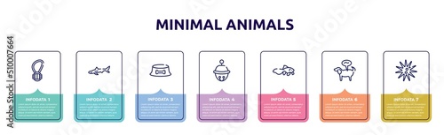 minimal animals concept infographic design template. included rope toy, big shark, dog dish, sleighbell, gold fish, pet disease, sea urchin icons and 7 option or steps.