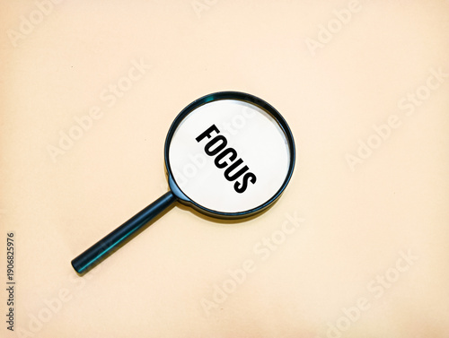 Minimal conceptual image of a magnifying glass highlighting the word focus, symbolizing concentration, clarity, productivity, strategic thinking, and goal achievement in business or personal growth.