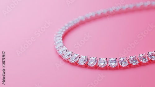 Minimal diamond tennis necklace glowing under diffused light, isolated on a smooth blush pink background