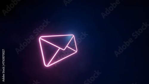 Minimal glowing envelope icon on dark background with neon holographic outline. Right-side copyspace for text, symbolizing digital communication.