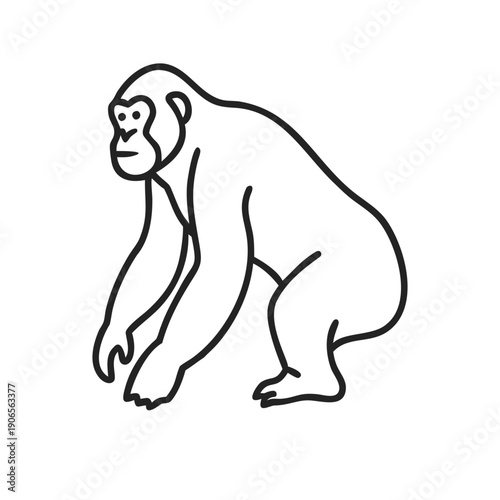 Minimal line art icon of a monkey vector illustration in clean outline style. Full-body gorilla standing, side view, isolated on white background. Clean monochrome contour drawing.
