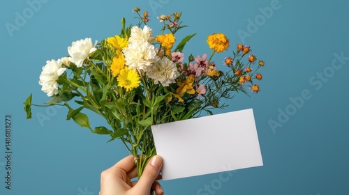 Minimal notecard design scene, hand holding paper with soft floral background