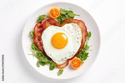 Minimal style men's breakfast featuring heart-shaped fried eggs, bacon, and veggies on a white plate, served as a surprise on Valentine's or Father's Day.