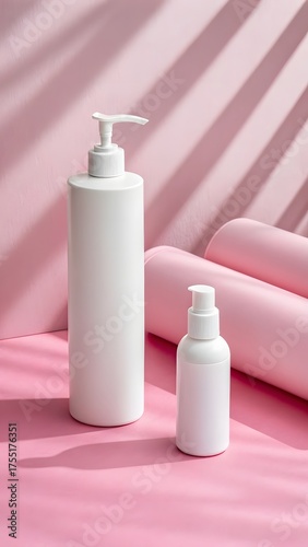 Minimal White Cosmetic Bottles With Pump Dispenser On Soft Pink Fabric Background In Natural Sunlight Shadows