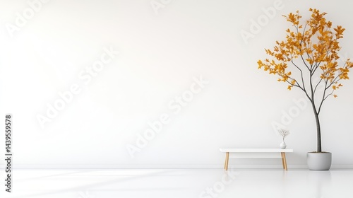 minimalist, autumn, living, room, home, interior, design, decor, white, empty, simple, modern, cosy, warm, fall, foliage, tree, plant, leaf, vase, bench, light, sunlight, natural, neutral, space, bright, clean, fresh, airy, furniture, contemporary, elegant, roomy, calm, peaceful, stylish, aesthetic, lighting