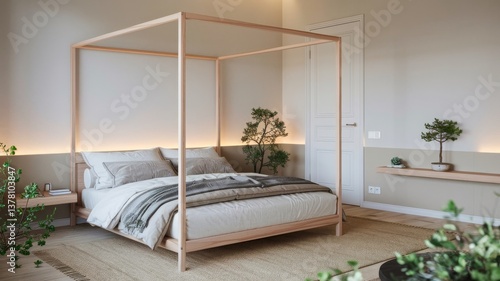 Minimalist bedroom featuring a light wood frame canopy bed, soft bedding, subtle lighting, and indoor plants for a serene atmosphere.