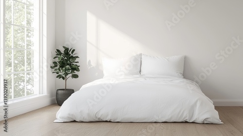 bedchamber, minimalist, modern, bright, light, airy, cosy, simple, clean, white, natural, plant, decor, interior, design, home, bed, linen, comfortable, sleep, relax, peaceful, calm, quiet, space, contemporary, elegant, chic, decorating, apartment, house, room, neutral, natural light, sunlight, window, foliage, plant, potted, bedding, mattress, soft, warm, relaxing