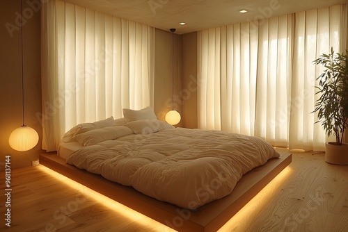 minimalist, bedchamber, cosy, lighting, ambience, serene, modern, interior, design, comfort, warm, natural, bed, decor, peaceful, relaxation, simplicity, contemporary, elegant, tranquil, soft, inviting, wood, neutral, harmony, calm, restful, stylish, chic, aesthetic, bright, glow, illumination, textile, architecture, home, lifestyle, zen, ambient, soothing, furnishing, light, roomy, clean