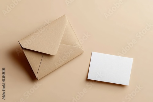 Minimalist beige envelope and blank card mockup on beige background with soft shadows and copy space