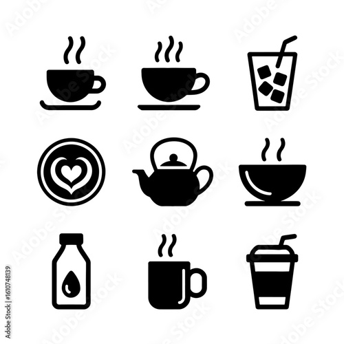 hot, drink, icon, minimalist, black, white, hot drink, tea, cup, mug, steaming, kettle, latte, art, milk, bottle, cold, iced, glasses, take-away, disposable, beverage, cafes, shop, eatery, break, menu, set, collection, simple, graphic, design, symbol, pictogram, vector, isolated