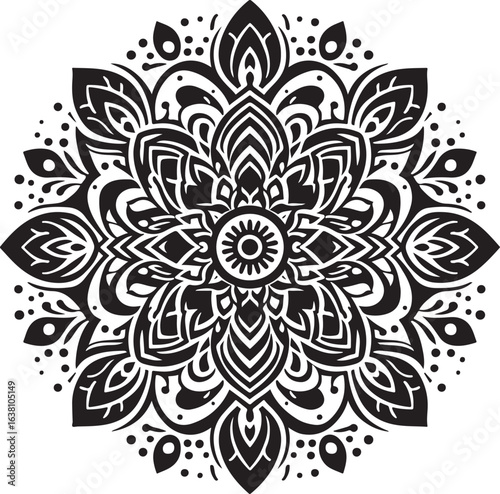 mandala, vector, illustration, minimalist, black, silhouette, isolated, design, element, decorative, pattern, geometric, circular, floral, spiritual, meditation, yoga, henna, tattoo, ornament, indian, eastern, ethnic, bohemian, ai, digital artwork, t-shirt, sticker, home decor, cardboard box, invitation, greeting card
