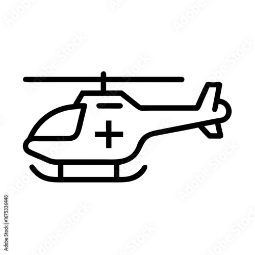 Minimalist black outline vector icon of a hospital helicopter with a medical cross, symbolizing emergency service, rescue, and healthcare. Isolated on a transparent background