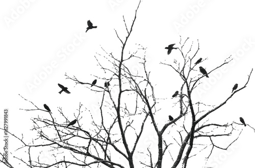 tree, tree branch, bird, bird, silhouette, vector, nature, wildlife, bare, leafless, flying, perched, minimal, black, white, seasonal, autumn, winter, design, illustration, graphic, scene, background, isolated, cut-out, shadow, contour, art, organic, ecosystem, fauna, flock, migration, sky, rustic, tranquil, elegant, calm, decorative, ornamental, scenic, empty, stock, wild, environment, peaceful, monochrome, simplicity