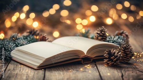 Minimalist blank photo album mockup lying open on a wooden table with cozy warm lighting perfect for branding corporate and design presentations