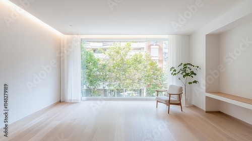 room, interior, modern, minimalist, home, apartment, house, design, architecture, window, light, bright, airy, roomy, clean, simple, elegant, style, hardwood, floor, chair, armchair, plant, green, tree, view, city, building, wall, white, wood, empty, calm, serene, peaceful, comfort, relaxing, lifestyle, living, space, contemporary, decor, furniture, sunlight, natural, fresh, openness, aesthetic