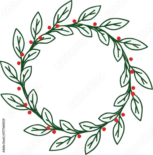 Minimalist Christmas wreath vector. Simple botanical frame with leaves and red berries. Holiday line art illustration.