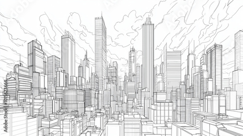 Minimalist Cityscape with Towering Skyscrapers in Line Drawing