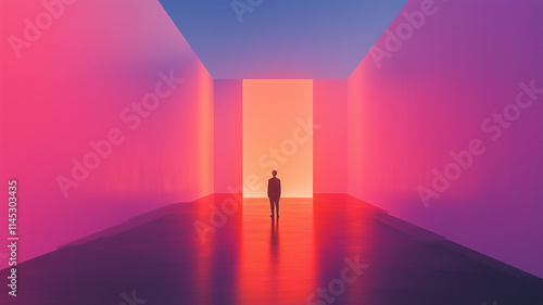 Minimalist composition of man in silhouette standing in pink and purple doorway. Evokes lonely transformation of the human species and moving from one space to the next.