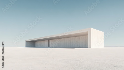 building, architecture, modern, minimalist, concrete, exterior, landscape, desert, sand, sky, light, pale, white, structure, contemporary, simple, geometric, facades, long, rectangular, horizontal, shot, empty, no, people, space, daylight, wide, design, monochromatic, beige, form, sunlight, horizon, flat, plain, still, photorealistic, three-dimensional, model