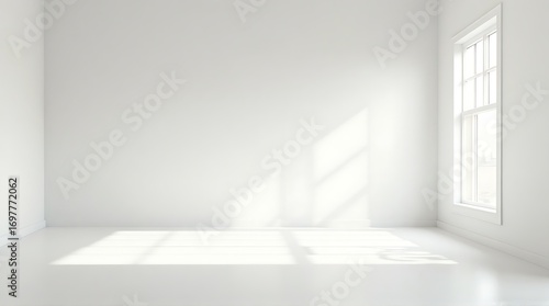 Minimalist Empty White Room with Bright Natural Light and Window Shadows