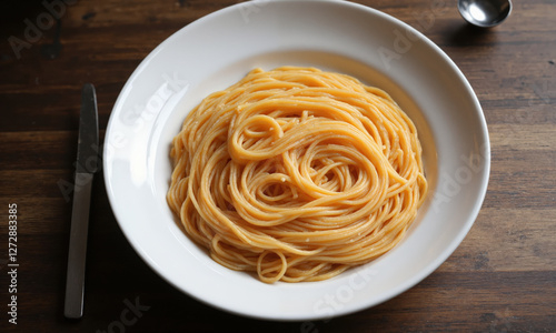 Minimalist face design made from spaghetti on an empty dinner plate, captured in ultra-realistic, 32k resolution. The clean lines
