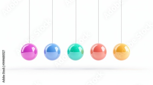 Minimalist Flat Design Of A Newton's Cradle With Five Colorful Balls In Motion Against A White Background