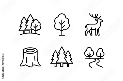 Minimalist forest icons: trees, deer, path, stump in linear style