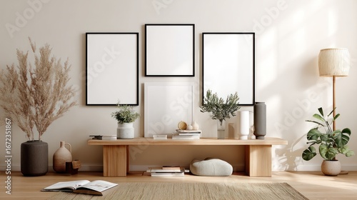 Minimalist Interior Decor with Potted Plants and Framed Wall Art in Bright Living Space