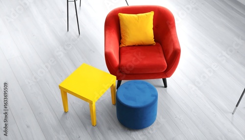 Minimalist interior design concept featuring bold primary color furniture. A stylish red armchair and vibrant accent pieces on a grey floor.