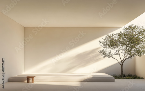 Minimalist interior with natural light and a tree casting shadows in a serene space