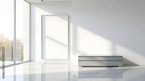 Minimalist interior with natural light showcasing an empty wall and a sleek storage unit, exuding calm and simplicity.