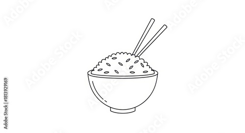 Minimalist line art illustration showcasing bowl of rice and chopsticks providing cultural flavor