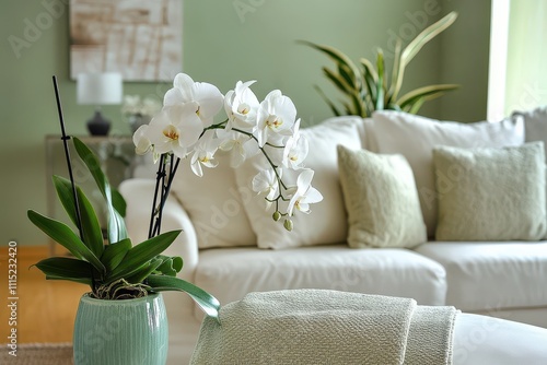 Minimalist living room soft pastel green walls white modern sofa sage green accent chair