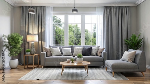 Minimalist Living Room with Gray Sofa and Elegant Window Treatments for Modern Home Decor Inspiration