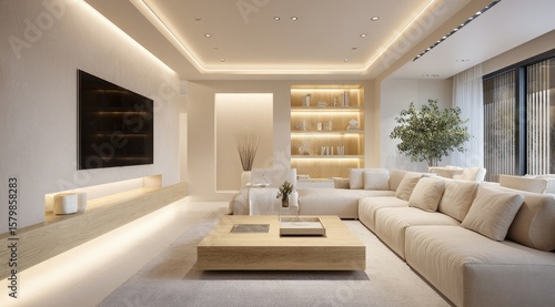 modern, minimalist, contemporary, living, room, interior, design, neutral, beige, cream, light, warm, sectional, sofa, couch, furniture, shelving, built-in, lighting, television, screen, wall, wood, wooden, hot drink, table, plant, tree, olive, calm, serene, peaceful, roomy, elegant, sophisticated, clean, line, simple, style, home, decor, comfort, relaxation, cosy, ambience, luxury, architecture, aesthetic