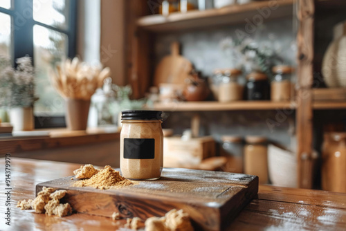 Minimalist mockup of a jar of yeast isolated on a clean, light background. Dry yeast, jar with yeast, active sourdough, yeast block, bread sourdough, homemade sourdough, rye sourdough