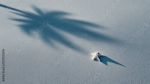 minimalist, palm, tree, shadow, sand, during, bright, midday, single, vibrant, starfish, right, corner, soft, even, lighting, creating, calm, atmosphere, colours, clean, background, serene, composition, inspiration, concept, colours, design, detail, art, empty space, modern, style, visual, abstract, professional, creative, scene