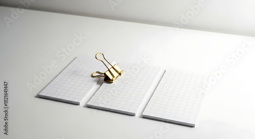 Minimalist office supplies concept with blank grid paper notepads and a golden binder clip on a clean white background