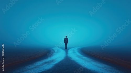 Minimalist person standing at a fork in the road, [Decision Point], [Success Journey], No logo, No Trademark, No text, minimal concept with copy space for stock photo