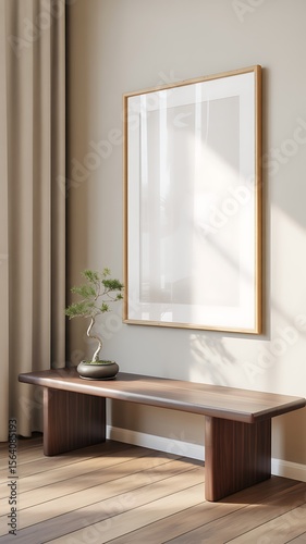interior, living room, minimalist, modern, natural, wood, bonsai, plant, artwork, frame, curtain, bench, light, shadow, beige, brown, serene, calm, elegant, simple, clean, home, decor