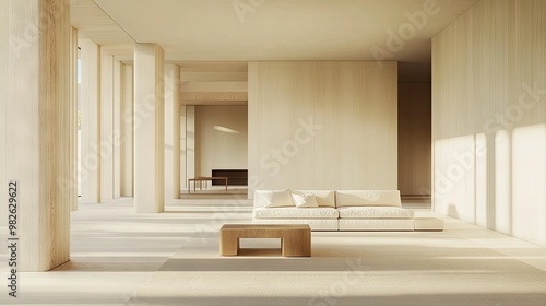 Minimalist studio apartment with light-toned furniture and large, empty walls offering ample copy space. The design is open and uncluttered. -