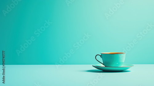 Minimalist turquoise coffee cup and saucer on a smooth turquoise surface with soft natural lighting, creating a serene and modern ambiance in the composition