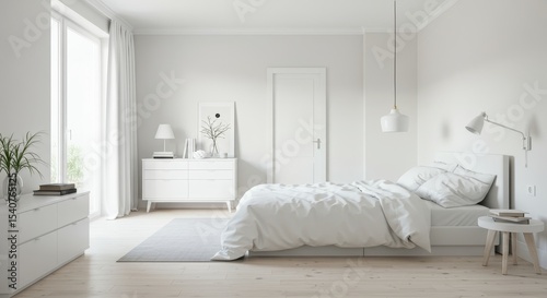 Minimalist White Bedroom Interior Design - Serene, simple, and stylish bedroom. White bedding, modern furniture, natural light, and a calming atmosphere create a peaceful retreat.