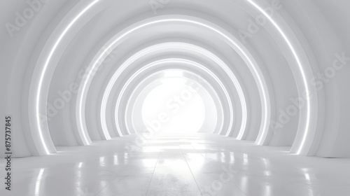 Minimalist white corridor with concentric patterns leading to a central bright light, symbolizing a journey to enlightenment