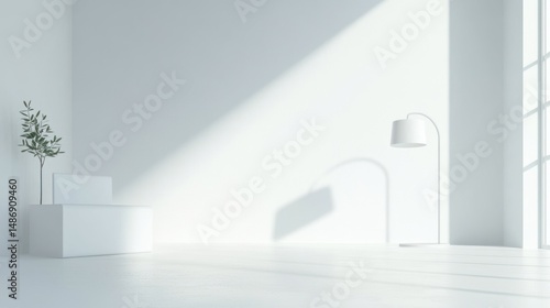 Minimalist white interior scene with plant desk and lamp